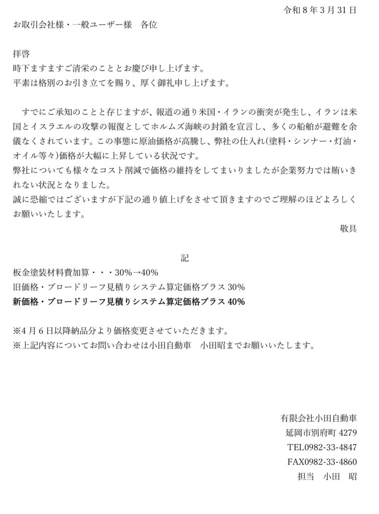 すでにご承知のことと存じますが、報道の通り米国・イランの衝突が発生し、イランは米国とイスラエルの攻撃の報復としてホルムズ海峡の封鎖を宣言し、多くの船舶が避難を余儀なくされています。この事態に原油価格が高騰し、弊社の仕入れ(塗料・シンナー・灯油・オイル等々)価格が大幅に上昇している状況です。